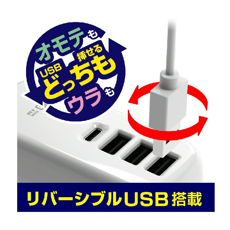 カシムラ AC-024 ACUSB-3A+C-24W 1.2m リバーシブル 自動識別 WH 商品説明 ●USB-A 3ポートとUSB Type-C 1ポート搭載のUSB電源タップ。