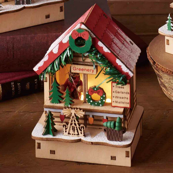 LED木製クリスマスマーケット グリーンナリィ W9×H12cm 1個クリスマスリースやツリーなどの植物を売っているお店の形の小さな木製オブジェです。商品棚やレジ前はもちろん、受付にもおすすめのクリスマス飾りです。クリスマス 飾り 装飾 雑貨