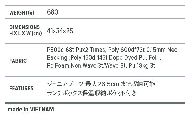 【FEATURES】 ジュニアブーツ 最大26.5cm まで収納可能 ランチボックス保温収納ポケット付 【重量】 約680g 【概寸】 約 41x34x25 cm 【素材】 P500d 68t Pux2 Times, Poly 600d*72t 0.15mm Neo Backing ,Poly 150d 145t Dope Dyed Pu, Foil , Pe Foam Non Wave 3t/Wave 8t, Pu 18kg 3t 【在庫・品質管理について】 こちらの商品は楽天販売分として注文可能数量の在庫を確保しております。