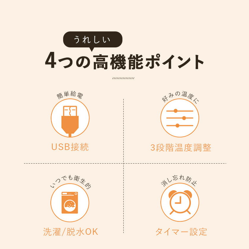 商品名称 電気ブランケット 商品仕様 素材:ブランケット:ポリエステル、ヒーター:ボンファイバー 電源:5V/2A ブランケットサイズ:約100×65cm ヒーターサイズ:約30×20cm 重量:約476.5g コードの長さ:約175cm 温度設定:低・中・高 約42℃〜50℃ 時間設定:60分/90分/120分 備考 ※掲載の商品画像について:お使いのパソコンモニターなどの環境によって、実際の商品と色味が異なって見える場合がございます。