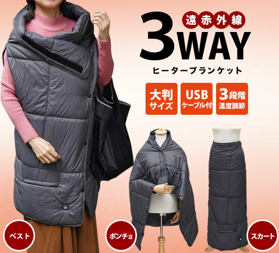 「腰に巻いてスカートスタイル」「肩から掛けてポンチョスタイル」「ボタンを留めてベストスタイル」と、冷えている場所を狙っておしゃれに温めます。