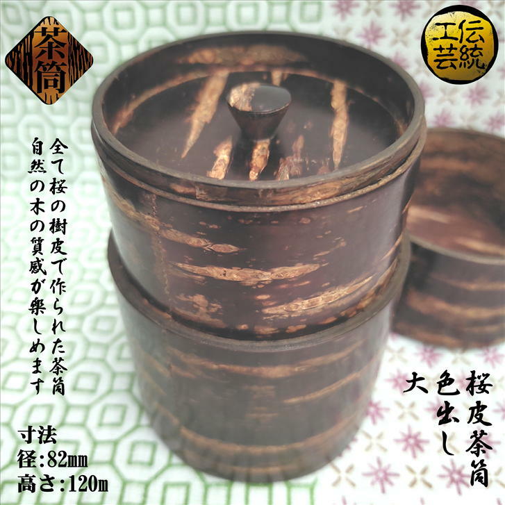 茶筒 桜皮茶筒 色だし 大 容量200g 寸法(径)82mm (高さ)120mm 桜 桜皮細工 ポッ・かん 茶缶 お茶缶 桜皮 木製 天然木 伝統工芸 抗菌 国産 手作り 中蓋 角館 ギフト プレゼント 母の日 父の日 中蓋付きで全て桜皮で作られた角館の茶筒。