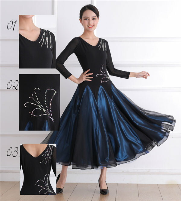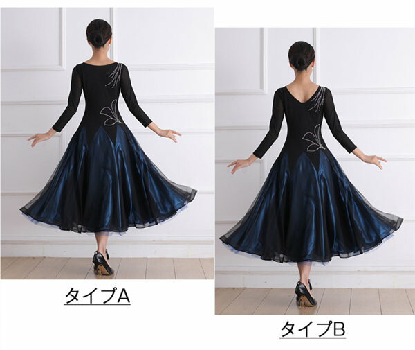 社交ダンスドレス ダンス衣装 社交ダンス ドレス 衣装 ダンスドレス Vドネック 2タイプ バイカラー 長袖 袖あり 上品 ミモレ丈 スタンダードドレス ワルツ モダン 競技ダンス ダンスウェア レッスンウェア ブラック ネイビー S M L XL